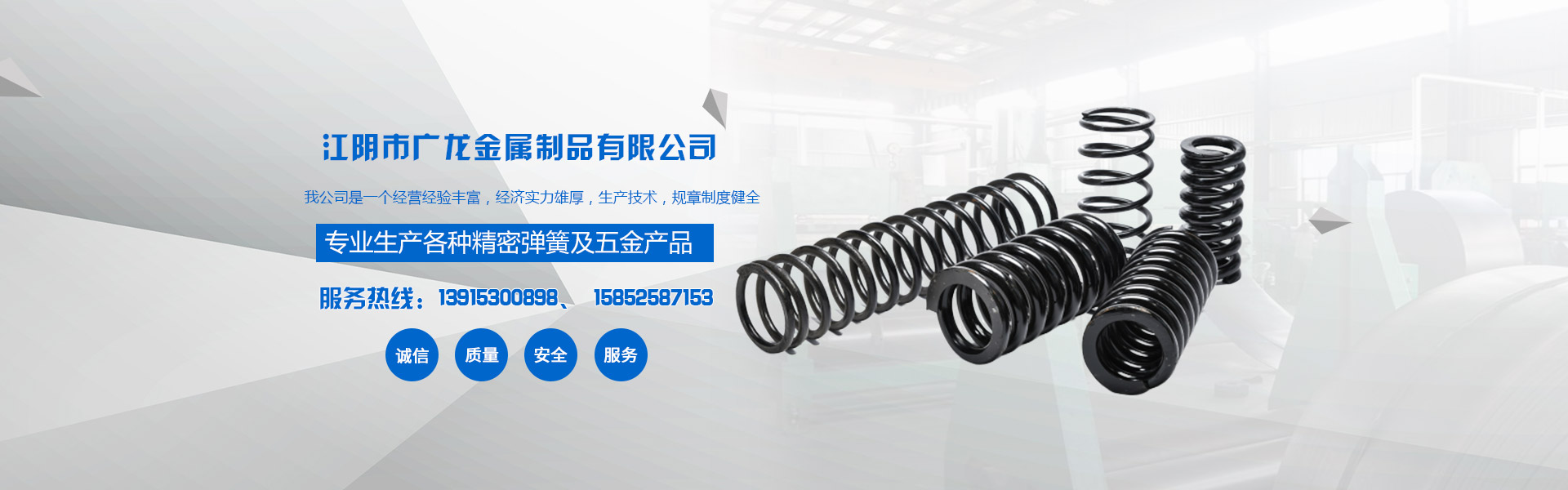 江陰市廣龍金屬制品有限公司,位于風景美麗的江陰市。我公司是一個經營經驗豐富,經濟實力雄厚,生產技術,規章制度健全,服務多元化,產品多元化,產品質量高的金屬制品公司。主營產品:電動工具彈簧、各類化妝品噴霧壓簧、各類異形彈簧、化妝品瓶蓋配重彈簧、精密儀器壓簧、卡簧、拉簧、扭簧、塔簧、油封彈簧、座椅掛鉤等彈簧兼容行業多的綜合性公司,如果您對我公司的產品服務感興趣,請在線留言或者來電咨詢,聯系電話:13915300898!